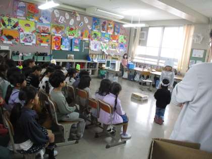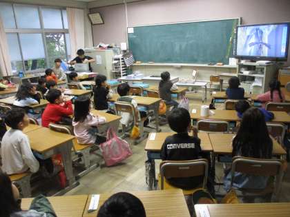 3組は国語の授業で、「おはなしのくに」というビデオを見ながら、「おはなし」の内容をよく考えながら流れをつかんでいく学習をしていました。