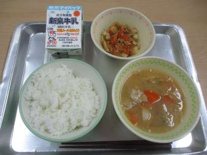 今日の献立は、ご飯に牛乳、豚汁と揚げじゃがのそぼろあんかけでした。