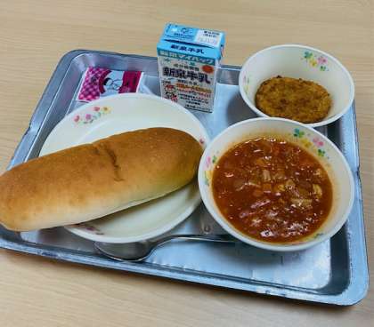 14日(火)の給食は、牛乳・コッペパン・ミネストローネ・さかいのめぐみコロッケ・だいずチョコクリームです。堺市は小松菜の生産が盛んで、給食で使用する小松菜はすべて堺市でとれたものです。地域でとれたものを地域で消費することを、地産地消といいます。今日は、その小松菜を使って作った「堺のめぐみコロッケ」です。堺のめぐみを味わって食べました。