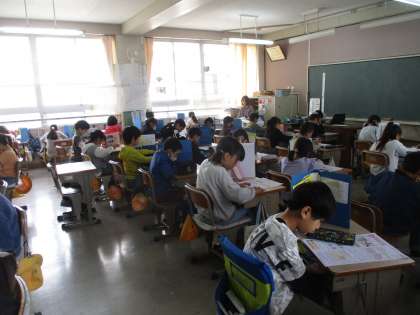 2組は社会の授業で、「安全な暮らしを守る」という単元の「火事から人々を守る」という項目のまとめテストに取り組んでいました。