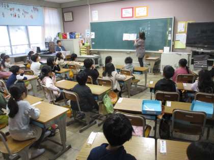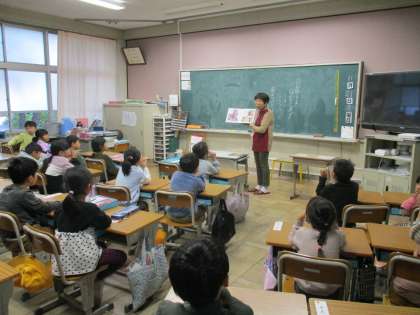 アリスの会の方による絵本の読み聞かせが始まると、静かに聞き入っている1年生。絵本の読み書かせをしてくださるのを、いつも楽しみにしている子がたくさんいます。