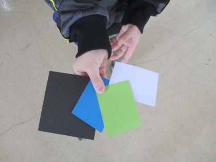 「光のせいしつ」の学習で、「白色・黄緑色・青色・黒色」の4色の画用紙に、それぞれ虫めがねで光を集めたらどのようになるかを実験を通して確かめていました。