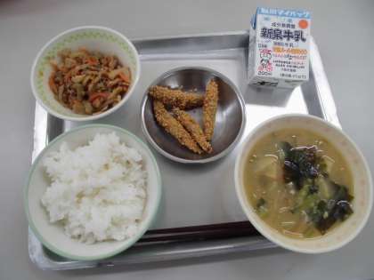 24日(金)の給食は、ごはん・きんぴらごぼう・きびなごフライ・まごはやさしいみそ汁・牛乳です。今日は和食の日です。和食は自然の恵みをいかす食文化としてユネスコ無形文化遺産に登録されました。ごはんを主食として、汁物やおかずを食べる『一汁三菜』の食事スタイルが、健康によいと世界からも注目されています。
