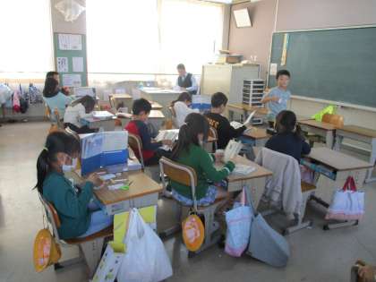 3組は、課題を終えた子が、各自ですることを考えて静かに過ごしていました。読書している子もいれば、ドリルパークを使って学習するために保管庫にタブレットPCを取りに向かっている子もいました。