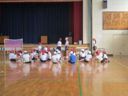 クラス全体で集まって、先生からルールや進め方を伝えられていました。その後、各コートで試合をしていました。