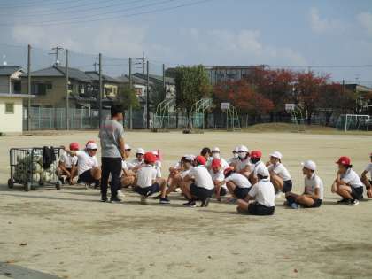 2組は、運動場でサッカーをしていました。
