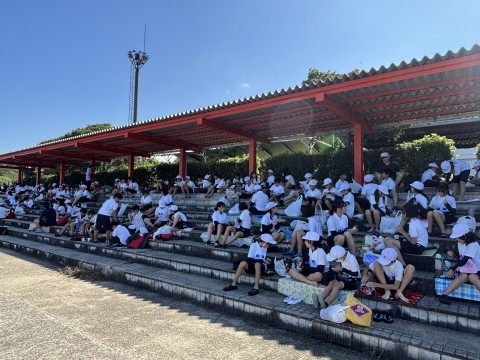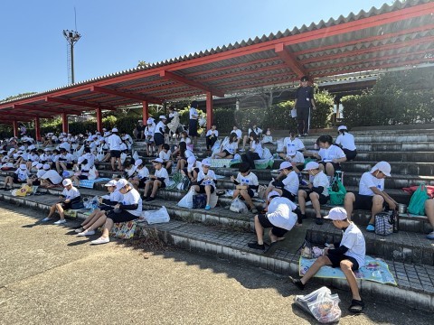 午前の海の活動を終えて、お弁当を食べています。午後からも元気に活動できるようにしっかり食べましょう。