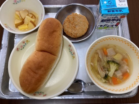 今日のフルーツコンポートにりんごを使っています。りんごは東北地方の青森県でたくさん作られています。りんごに含まれる食物繊維は、おなかの調子を整えてくれる働きがあります。