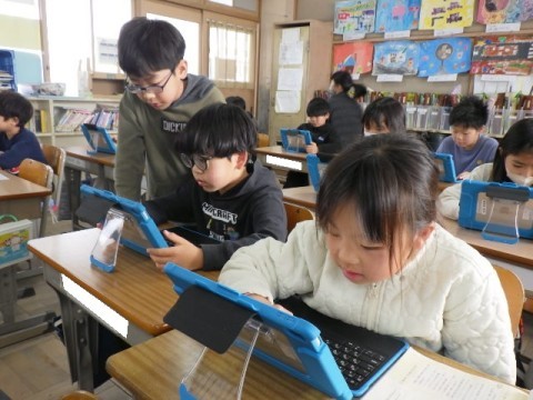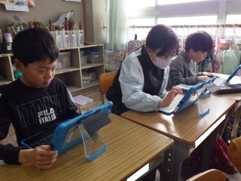 国語の学習で新しいタブレットを使っていました。使いこなしています。