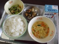 今日の給食 「コッペパン 牛乳 なす入りミートスパゲティ いそのサラダ」