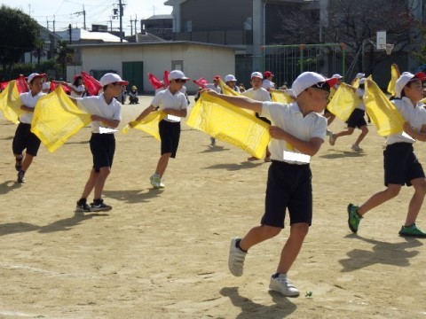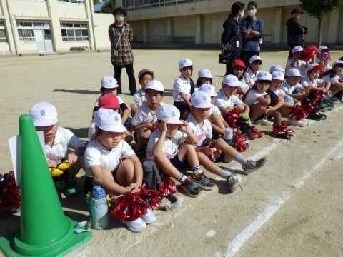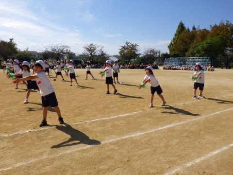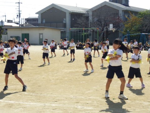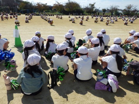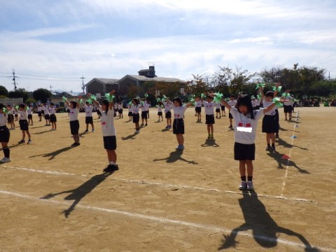 1年生から4年生の児童が、体育参観で披露してくれた団体演技を見せてくれます。全校児童で鑑賞しました♪