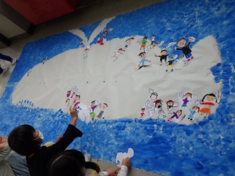 119人全員でくじらぐもに乗ろう!一人一人,くじらぐもへの思いも一緒に書き込んでいます。完成が楽しみです♪