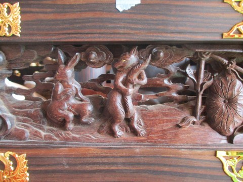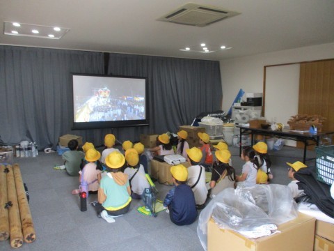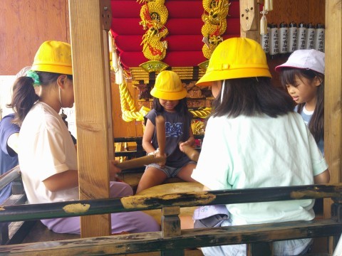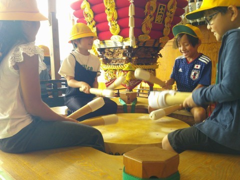ふとん太鼓を担いでいるビデオを観たり,実際にふとん太鼓に乗ったり,太鼓をたたいたり,させてもらいました。
