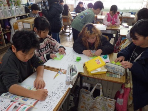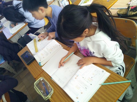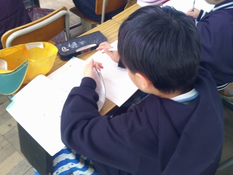 新出漢字の学習をしています。書き順を覚えるために,みんなで空書きをしています。