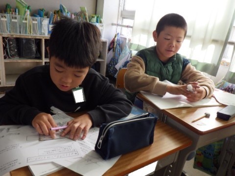三角定規を2枚使ってある辺に対し平行な直線を書きます。みんな,先生の説明を聞きながら一生懸命操作していました♪