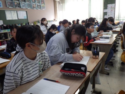 防災について配信にて出前授業を受けています。熱心にメモを取りながら,話を聞いています。