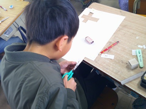 算数で立体の学習をしています。ボール紙を使って,いろいろなサイズの立方体を作っています。