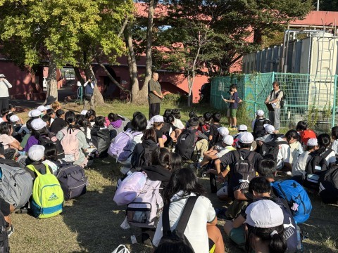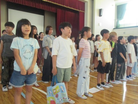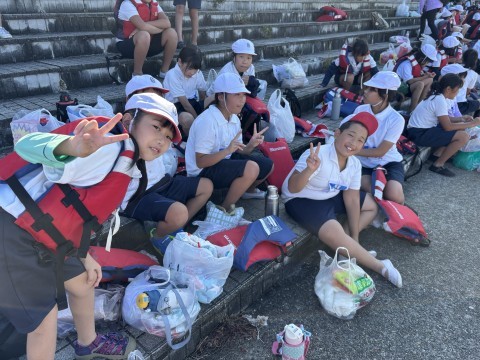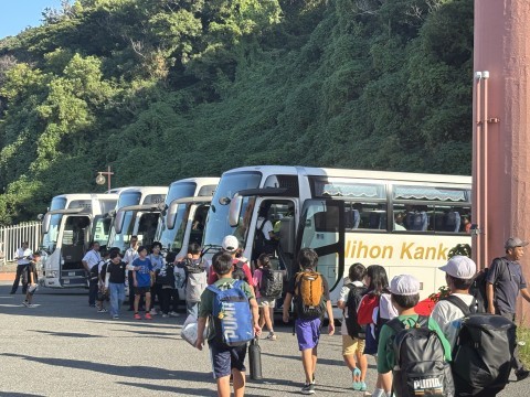 海の活動が終わり、着替えて、退館式をしました。今からバスに乗って小学校へ向かいます。