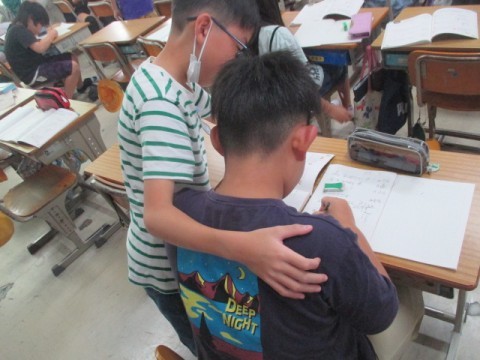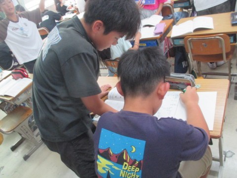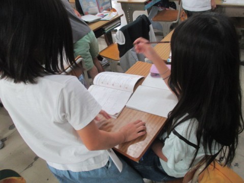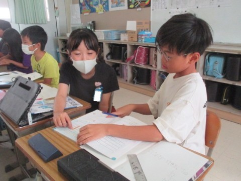 算数の学習で分数の計算をしています。友だちと教え合いながら学習を進めています。