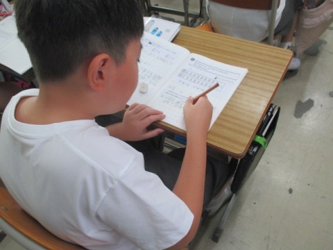 算数の学習で分数の計算をしています。素早く最小公倍数を見つけて計算しています。