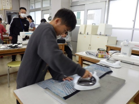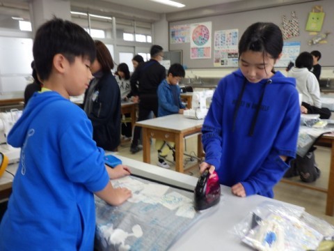 エプロンづくりに熱心に取り組んでいます。これまで練習してきたアイロンやミシンをしっかり使いこなしながら取り組んでいます♪