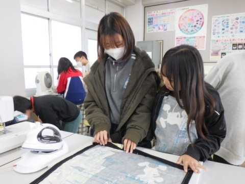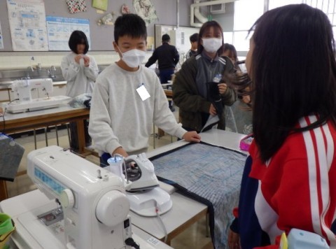 エプロンづくりに取り組んでいます。生地の端の糸がほつれてこないよう織り込んでいます。アイロンが大活躍しています♪