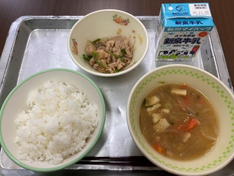 今日のメニューは、・ごはん・牛乳・ちゃんこ汁・豚肉のしょうが炒め です。「ちゃんこ」とは、おすもうさんが食べたり、作ったりする料理のことです。代表的な料理に「ちゃんこ鍋」があります。今日は、給食用にアレンジして「ちゃんこ汁」にしました。