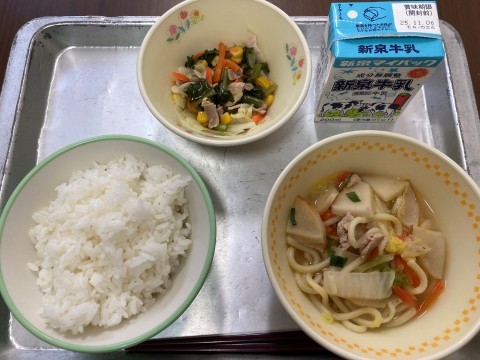 今日のメニューは、・ごはん・牛乳・ちゃんぽん麺・小松菜サラダ です。小松菜は、鉄分を多く含む食品です。鉄分が足りないと、からだが疲れやすくなったり、めまい・息切れなどが起こったりします。しっかり食べて、鉄分をとりましょう! -