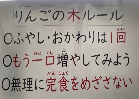 学校給食の献立作成では,成長期にある子どもたちの心身の発達のため適切な栄養量を摂取できるよう考えています。1食分を食べきることで必要な栄養が摂れるようになっていますので,一人ひとりが食べ過ぎを防ぎ,またできるだけ残さず食べることができるよう『もう一口食べる』ことをめざして,3つのルールを掲げて取り組んでいます。
