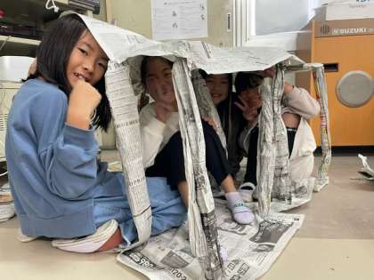 新聞紙で家やテントなどを作りました。友達と力を合わせて楽しんでいました。