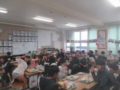 卒業まで、あと8日となりました。給食は、コロナが流行してから黙食が続いていましたが、「卒業までにみんなで机をつけて食べたい!」という6年生からの声があり,実現することになりました。今日は全クラス会食を楽しむことができ、本当によかったです。