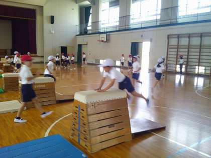 体育で跳び箱を使って「開脚飛び」に取り組んでいます。