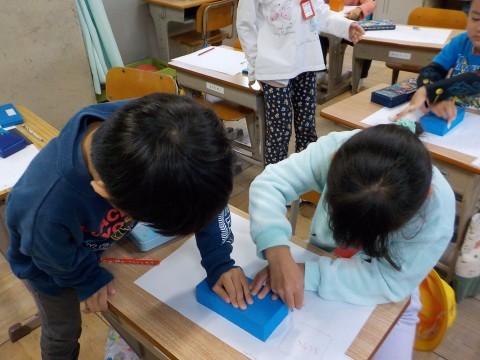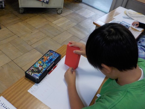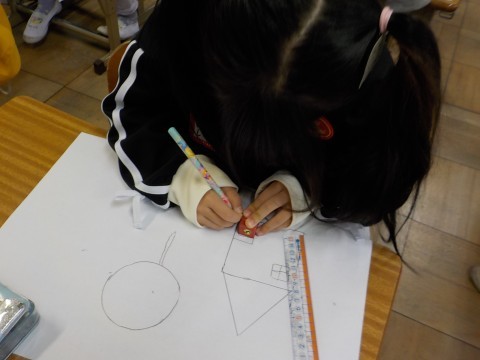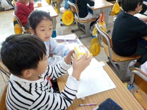 「球」について学んでいます。球のどこを切っても円であることを,パソコンの絵で確認しました。また,半分に切った時が一番,大きな円ができます。「半径」「直径」という言葉も習いました。
