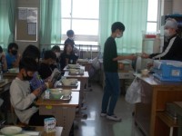 外国語では、ネイティブの先生と「How are you?」を使って、あいさつをしました。家庭科では、エプロンを作ります。どのデザインがいいのか、じっくり見ていました。算数では、約分のある分数×分数の仕方を練習していました。