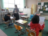 友だちや先生の夏休みにしたことを質問し、カードがビンゴするようにかわるがわるたくさんの人に聞いてみました。先生たちも、夏休みを楽しんだようです。