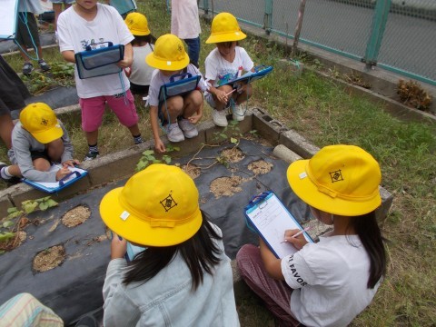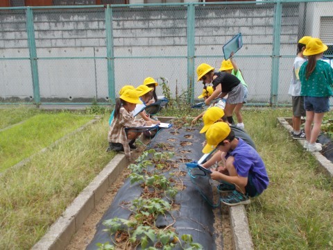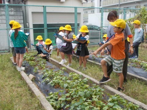 さつまいもの観察です。「葉がぬるぬるしているよ!」「茎がふにゃふにゃ」と特徴を見ることができました!前との変化を感じている人もいました。