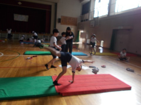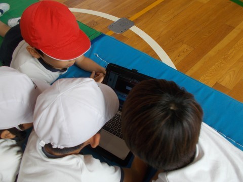 マット運動をしています。先生にコツを教えてもらったり,友だちがアドバイスをくれたりして,どんどん上手になっていきます。タブレットでの確認は,有効的です。