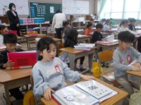 「高所作業車」や「パトロールカー」など,自分の選んだ車のつくりと役割について調べています。また,ワークに絵も描きながら説明の文章を書いていきます。道徳では「ジャングルジム」というお話から,誰とでも仲良くするには・・・を考えました。