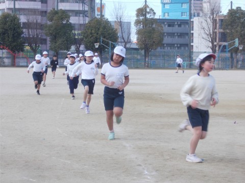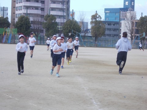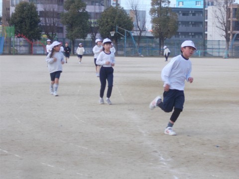 まず,体を温める活動をしました。寒い時間でしたが,しっかり走って鍛えました。