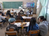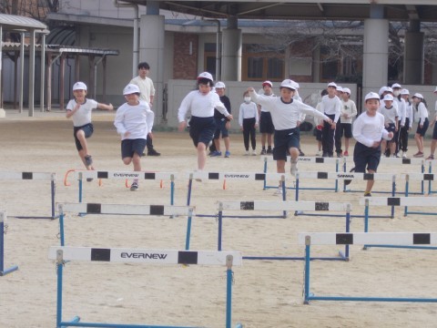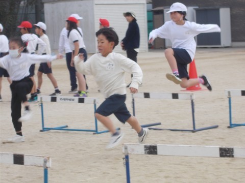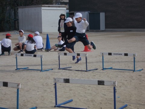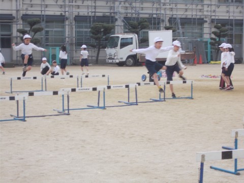 ハードル走をしています。助走からハードルまでの距離と踏切位置に気を付けて跳んでいました。何度も何度も繰り返し,練習していました。