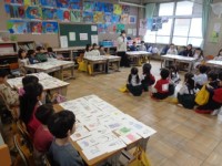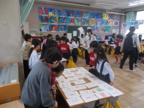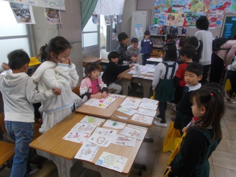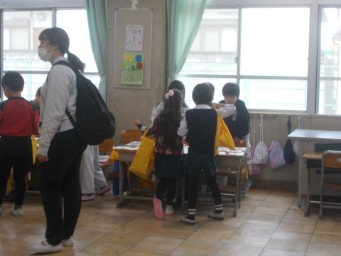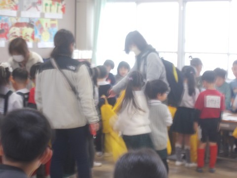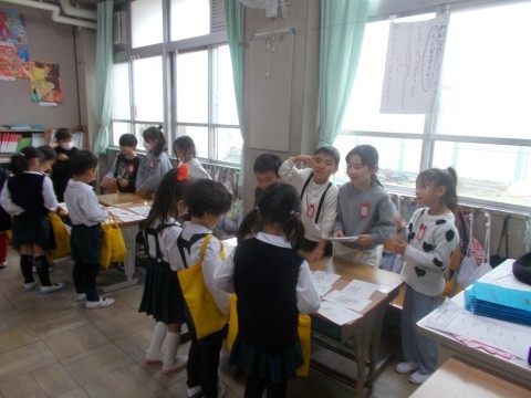 国語科「もののなまえ」で学習したことを,先日の参観授業でカードゲームをして深め,今回は,幼稚園のみなさんに「お店屋さん」で披露しました。児童の意欲的な活動により,学びが繋がっています。教材研究のたまものであると感じています。