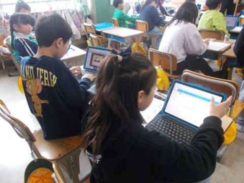 国語では「お気に入りの場所 教えます」の原稿をパソコンに打ち込んだり,発表を聞いたりしました。学校でのお気に入りの場所は「図書室」という人もいました。音楽では「帰り道」という曲を聞いていました。