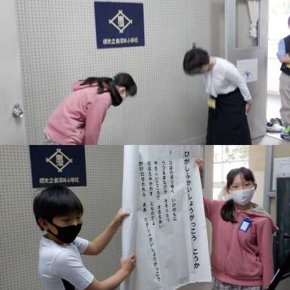 朝の挨拶,校歌を歌ったあと,校長先生から,「人にやさしく」「ありがとう。ごめんね」が言える子になろう。そして,「新しい自分」への挑戦について話がありました。