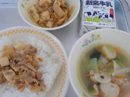 給食には,毎日牛乳が1本でてきます。牛乳には,骨や歯をつくる「カルシウム」が多く含まれています。また,みなさんの体をつくるもとになる「たんぱく質」もたくさん含まれています。しっかり飲みましょう。