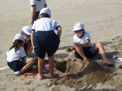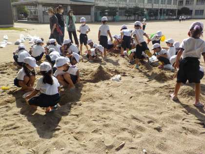3連休明けの火曜日,台風も過ぎ去り,心地よい天候の中,1年生は砂場でどろんこ遊びを楽しみました。