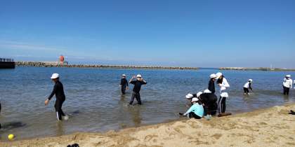 いかだ組とビーチ組の二手に分かれて活動します。 からっと晴れていて良い気持ちです