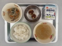 カナダでは、寒い冬を乗り越えるためにスプリットピーとよばれる乾燥のえんどう豆を使った「ピースープ」というスープがよく食べられています。今日は給食用にアレンジし、裏ごしのグリンピースを使ったポタージュにしました。他にもカナダでは、サーモンやメープルシロップが有名でよく食べられています。