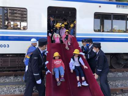 電車からの脱出訓練では、扉が開いたら駅員さんが滑り台のようなものを準備して、その上を滑りながら下りました。そのすべり台を見てみると、電車のイスが使われていて、それに気づいている子どもたちもたくさんいました。