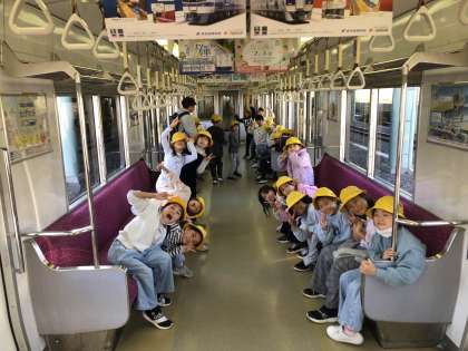 光明池車庫で訓練をしました。初めて止まっている電車を目の前で見ることができたり、線路の上を歩いたりと新しい体験をさせてもらいました。