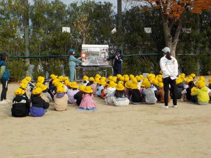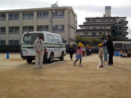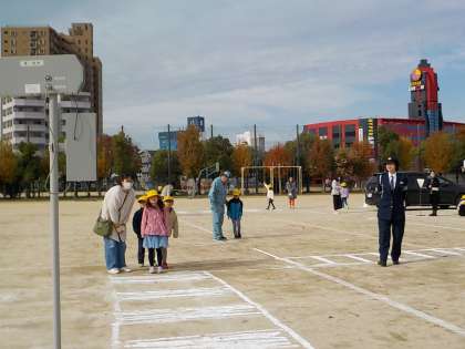 堺市役所と警察署から講師を招き交通安全教室を開きました。交通ルールを学習した後、お家の方にサポートしていただき、運動場の模擬道路をで正しく歩く練習をしました。